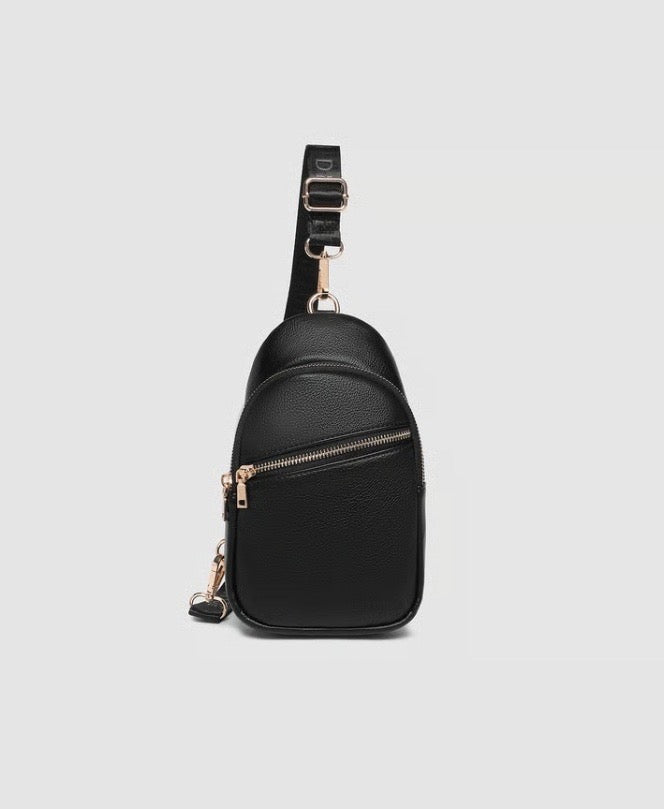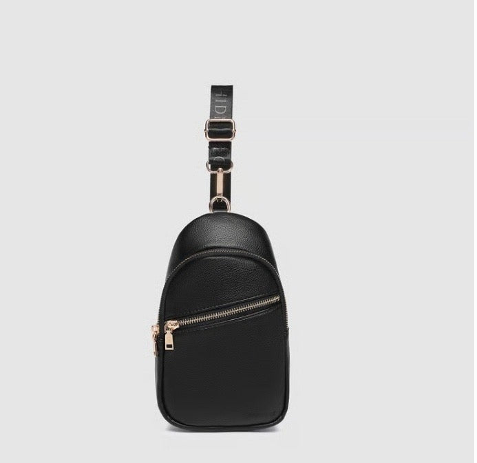 The Baby Bella Sling is your go-to light-weight hands-free bag for sightseeing, designed for warm-weather adventures and everyday ease. A petite take on our signature Bella Sling, she offers the same thoughtful functionality in a more compact silhouette - perfect for days that call for less fuss and more freedom. With two spacious compartments and secure zip closures, Baby Bella keeps your essentials close while keeping your look polished. Her adjustable and detachable sateen webbing strap is slimmer for all-day comfort and versatility, whether worn across the body or over one shoulder. Finished with light gold hardware and smooth vegan leather, she’s a travel crossbody bag that blends style with practicality. From airport terminals to cobblestone streets, Baby Bella is made to move with you - bringing elevated minimalism to your everyday adventures.