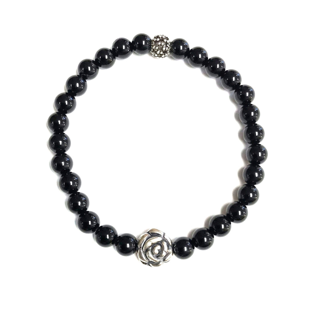 This well made, elasticated bracelet will fit up to 7.5 inches. Made with black onyx and sterling silver.